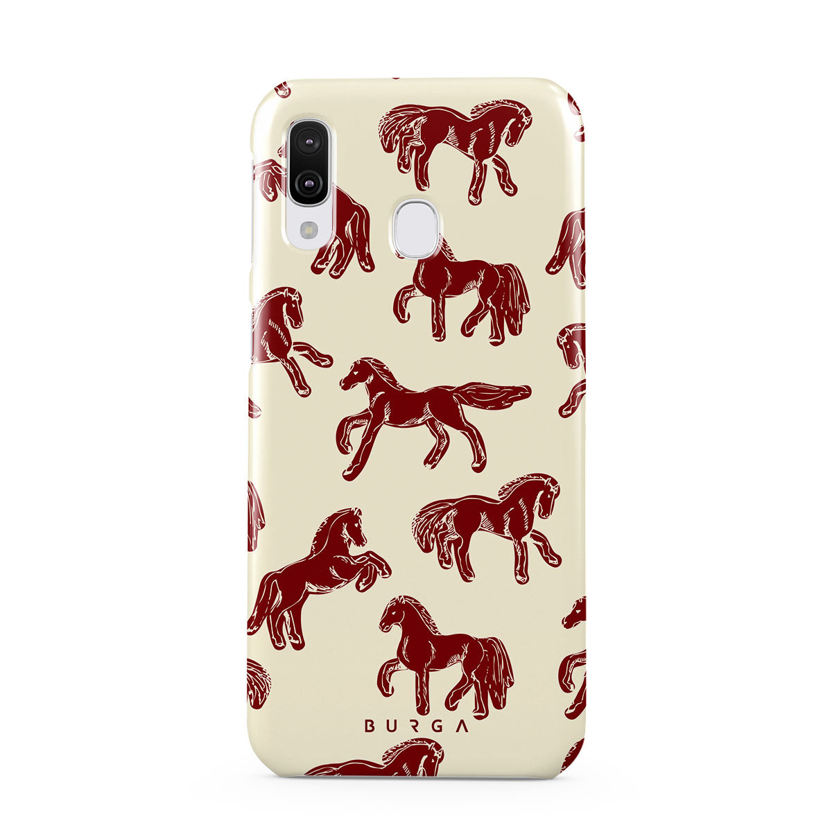 It's time to unleash your wild side with the Mustang design. Bold red horses gallop across a nude background, capturing the spirit of untamed adventure. This Samsung Galaxy A40 phone case is perfect for the free-spirited souls ready to ride into the unknown.