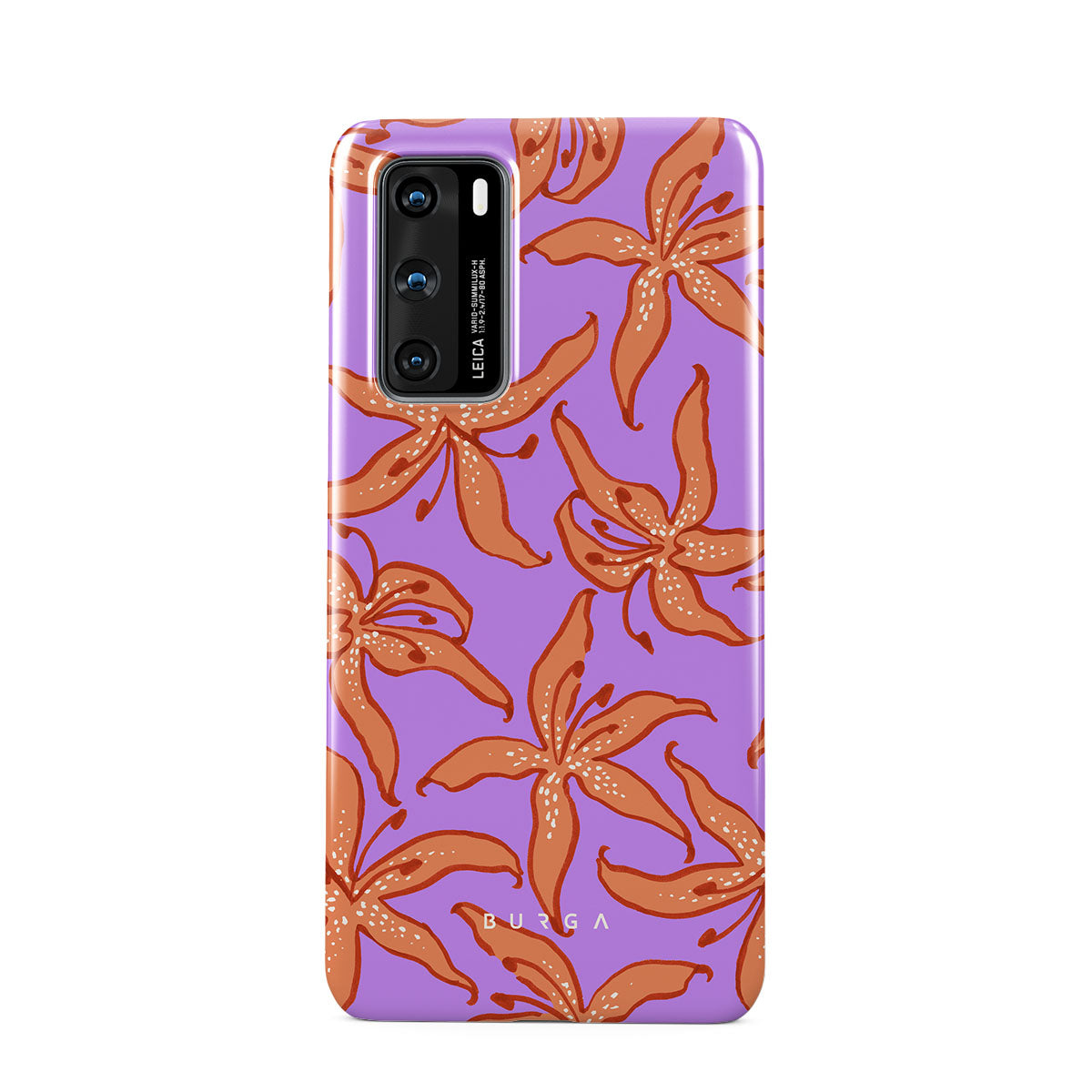 This design features: orange lilies, purple background