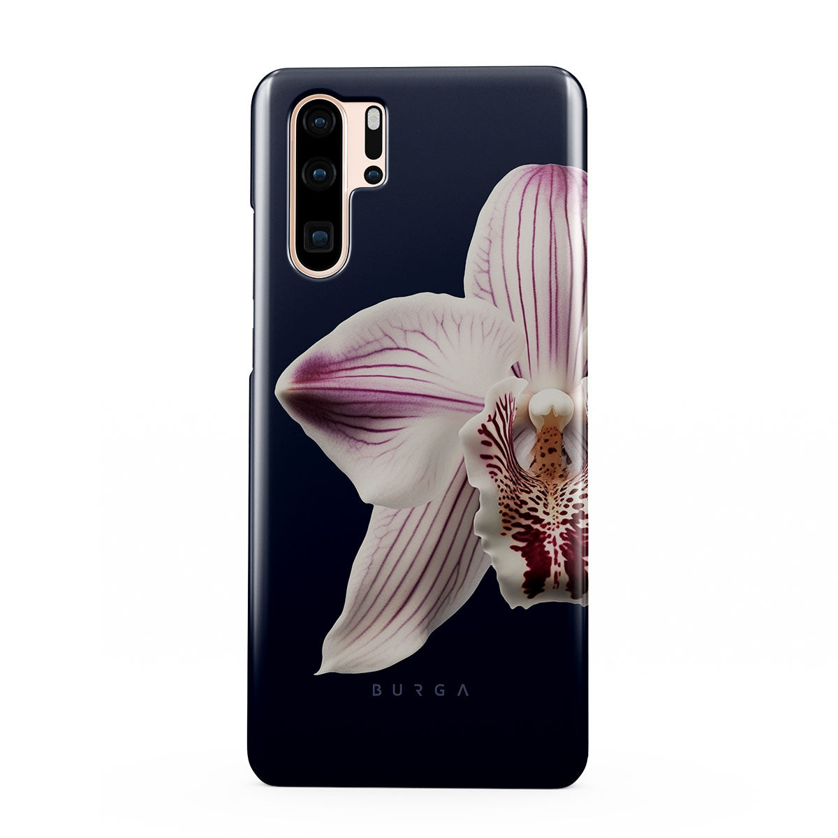The white orchid blooms boldly upon a night sky blue, a beacon of clarity in the darkness. Our Nectar Huawei P30 Pro phone case design speaks to the soul's desire to find light within, to illuminate the hidden paths of self-discovery that only reveal themselves under the cloak of introspection.