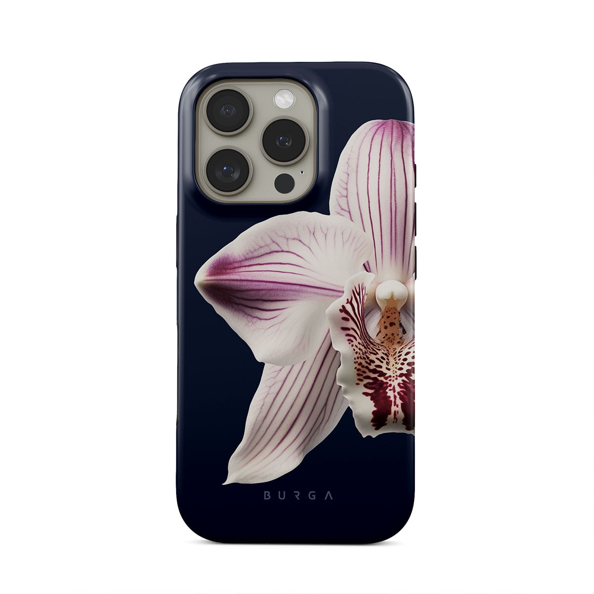 The white orchid blooms boldly upon a night sky blue, a beacon of clarity in the darkness. Our Nectar iPhone 16 Pro phone case design speaks to the soul's desire to find light within, to illuminate the hidden paths of self-discovery that only reveal themselves under the cloak of introspection.