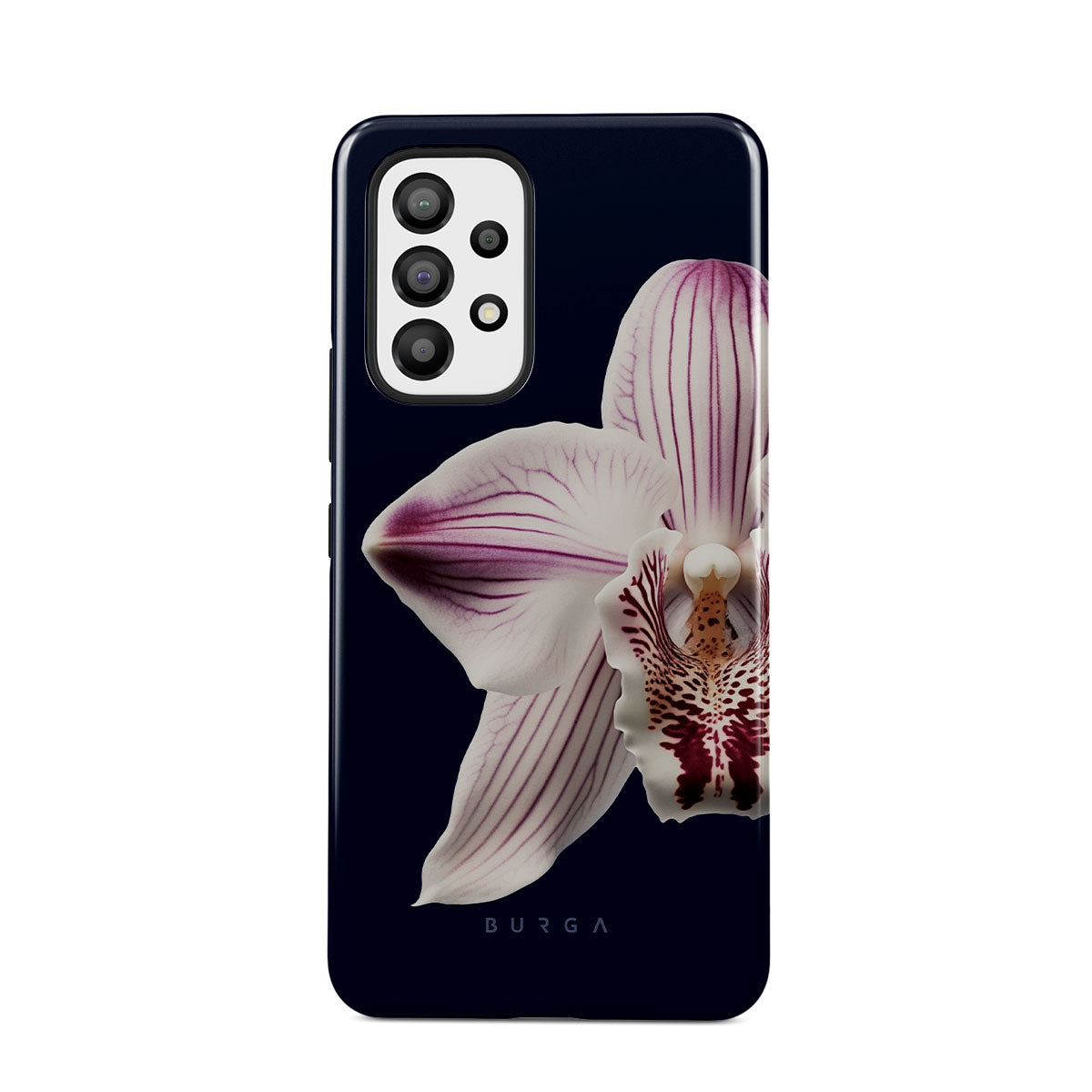 The white orchid blooms boldly upon a night sky blue, a beacon of clarity in the darkness. Our Nectar Samsung Galaxy A23 4G / 5G phone case design speaks to the soul's desire to find light within, to illuminate the hidden paths of self-discovery that only reveal themselves under the cloak of introspection.