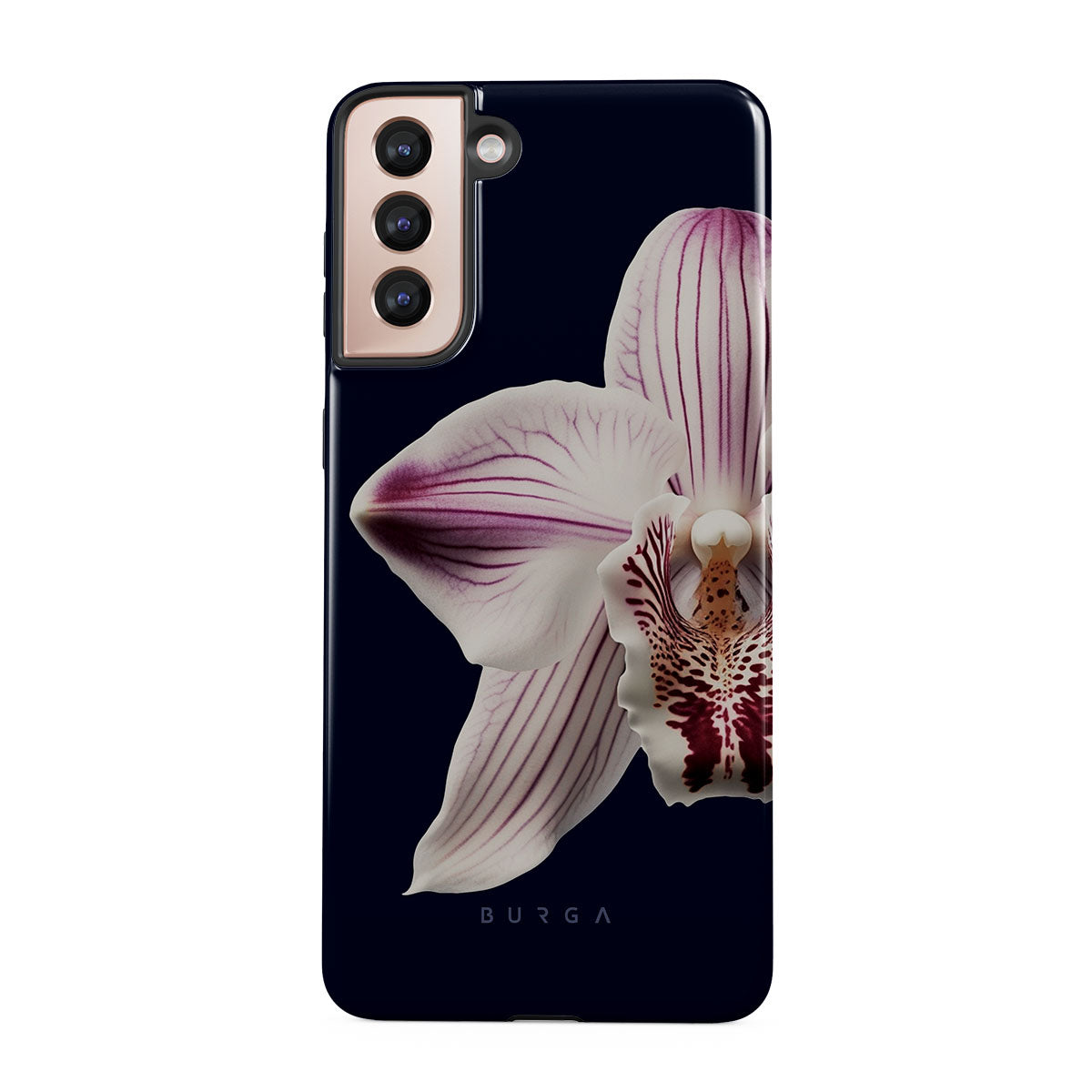 The white orchid blooms boldly upon a night sky blue, a beacon of clarity in the darkness. Our Nectar Samsung Galaxy S21 Plus phone case design speaks to the soul's desire to find light within, to illuminate the hidden paths of self-discovery that only reveal themselves under the cloak of introspection.