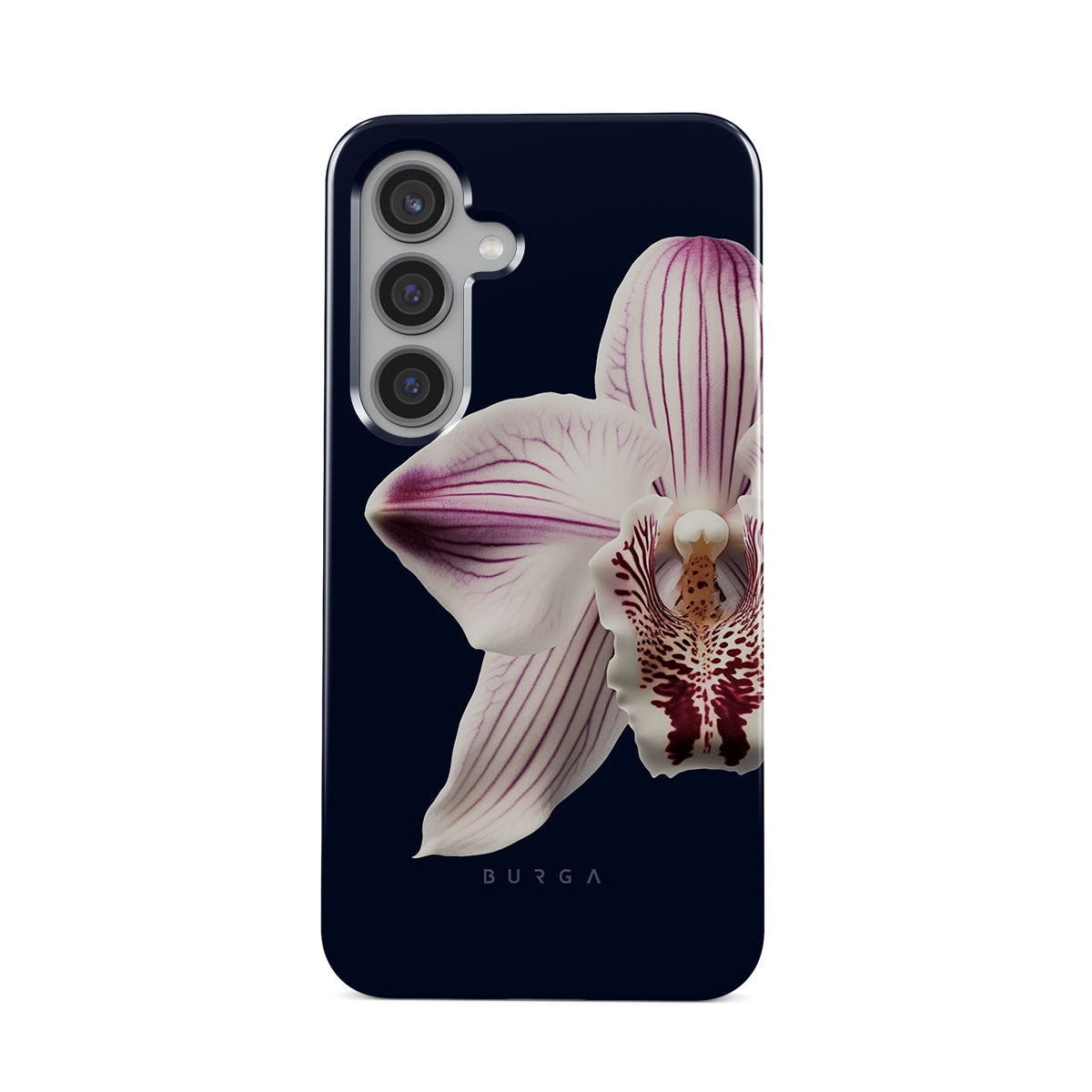 The white orchid blooms boldly upon a night sky blue, a beacon of clarity in the darkness. Our Nectar Samsung Galaxy S24 FE phone case design speaks to the soul's desire to find light within, to illuminate the hidden paths of self-discovery that only reveal themselves under the cloak of introspection.