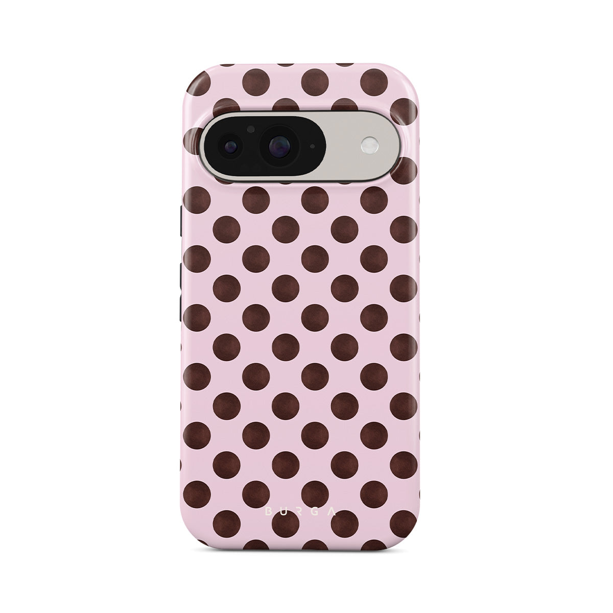 This design features: a retro polka dot pattern, pink background with brown polka dots.