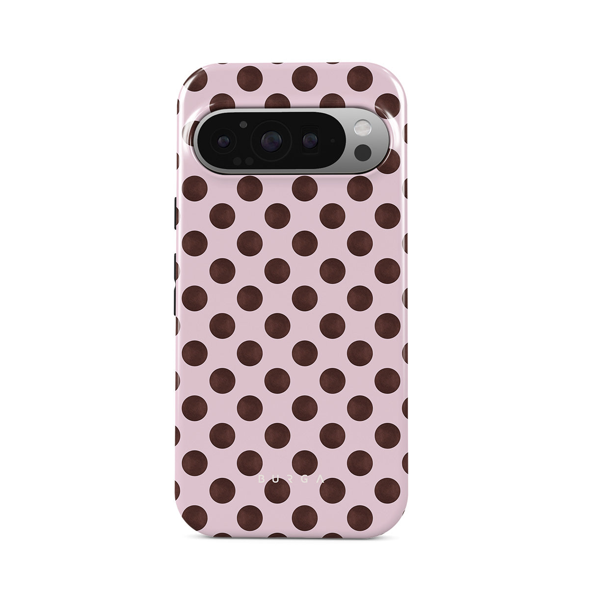 This design features: a retro polka dot pattern, pink background with brown polka dots.