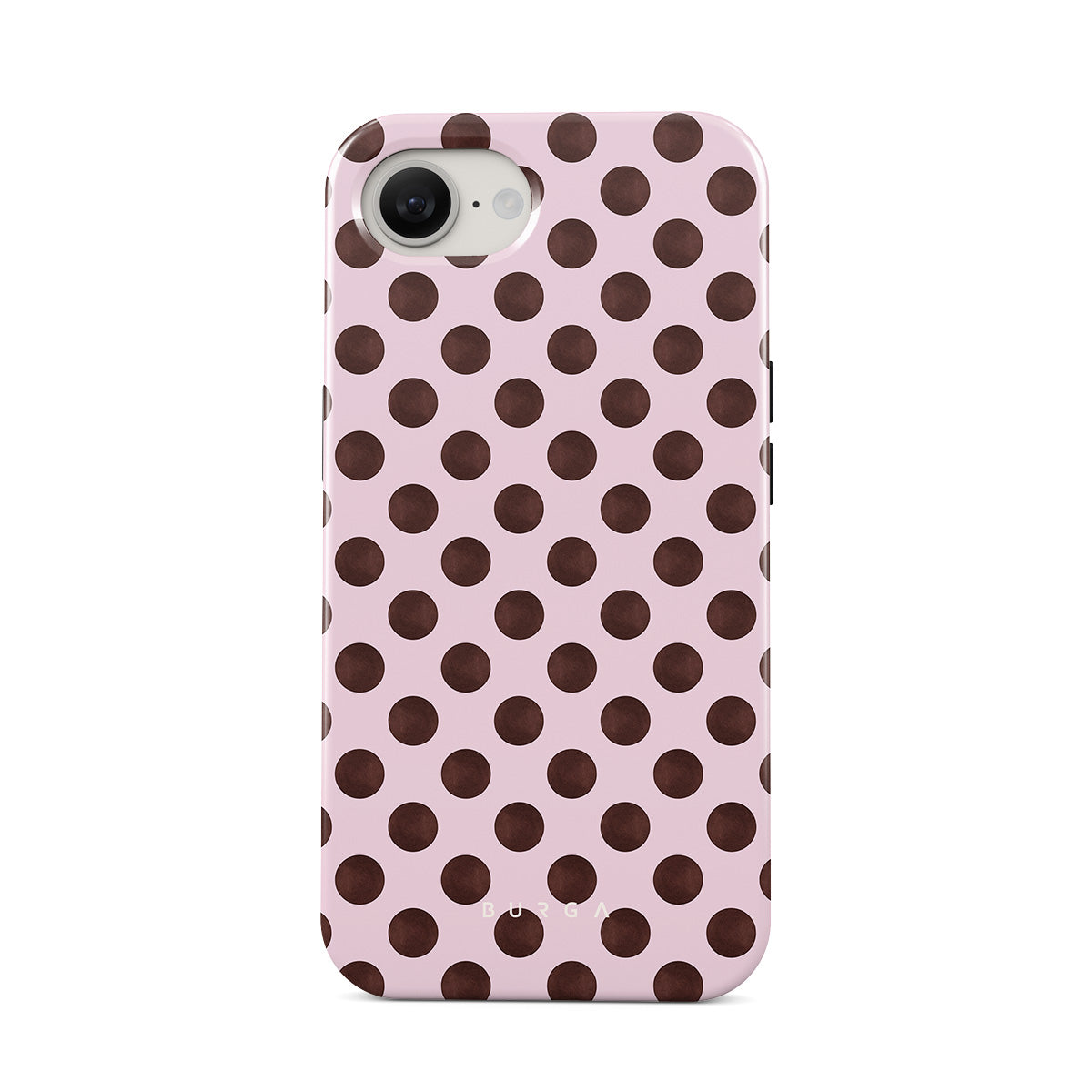 This design features: a retro polka dot pattern, pink background with brown polka dots.