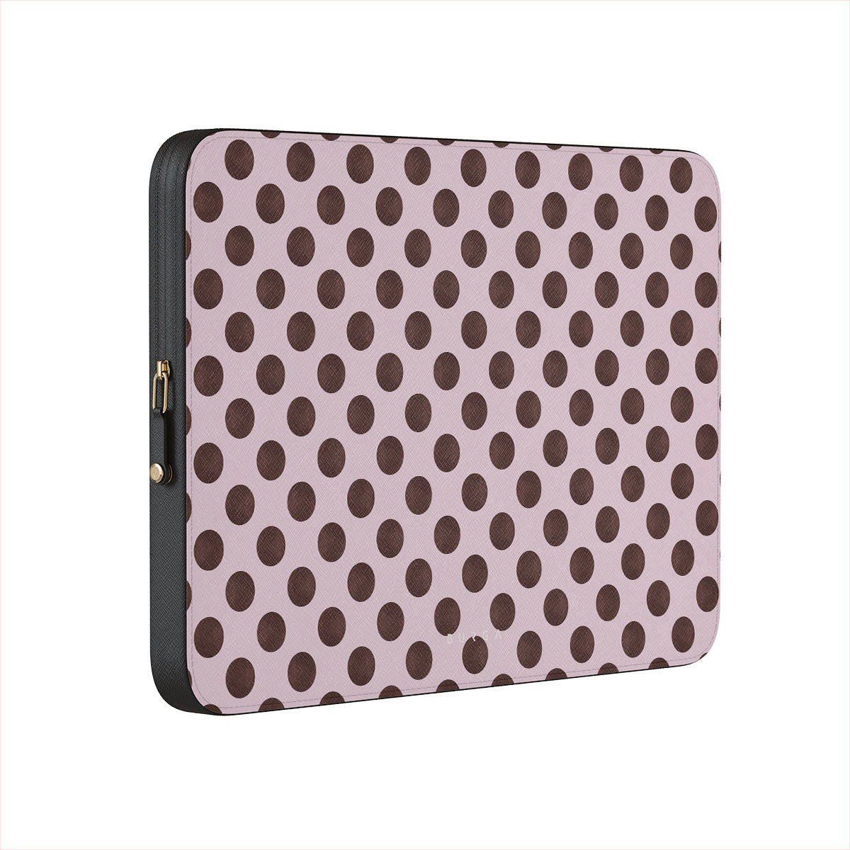 This design features: a retro polka dot pattern, pink background with brown polka dots.