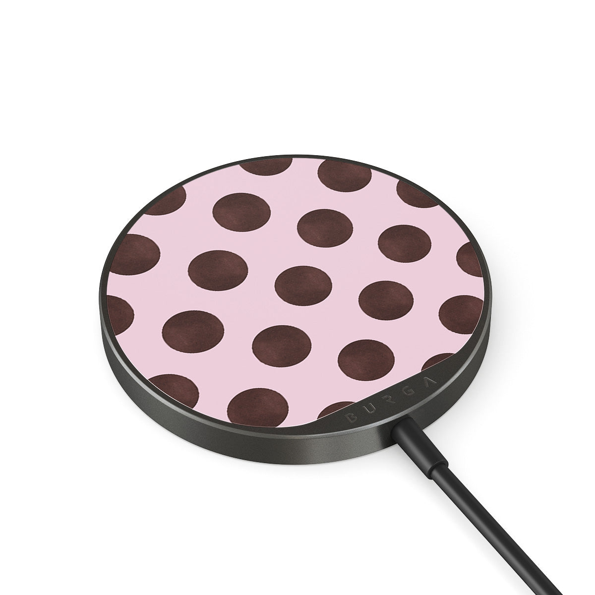 This design features: a retro polka dot pattern, pink background with brown polka dots.