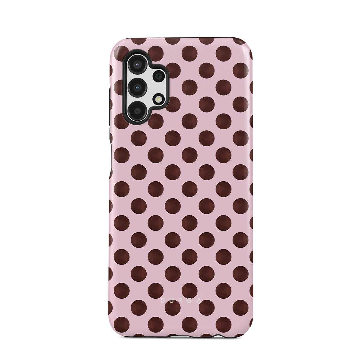 This design features: a retro polka dot pattern, pink background with brown polka dots.