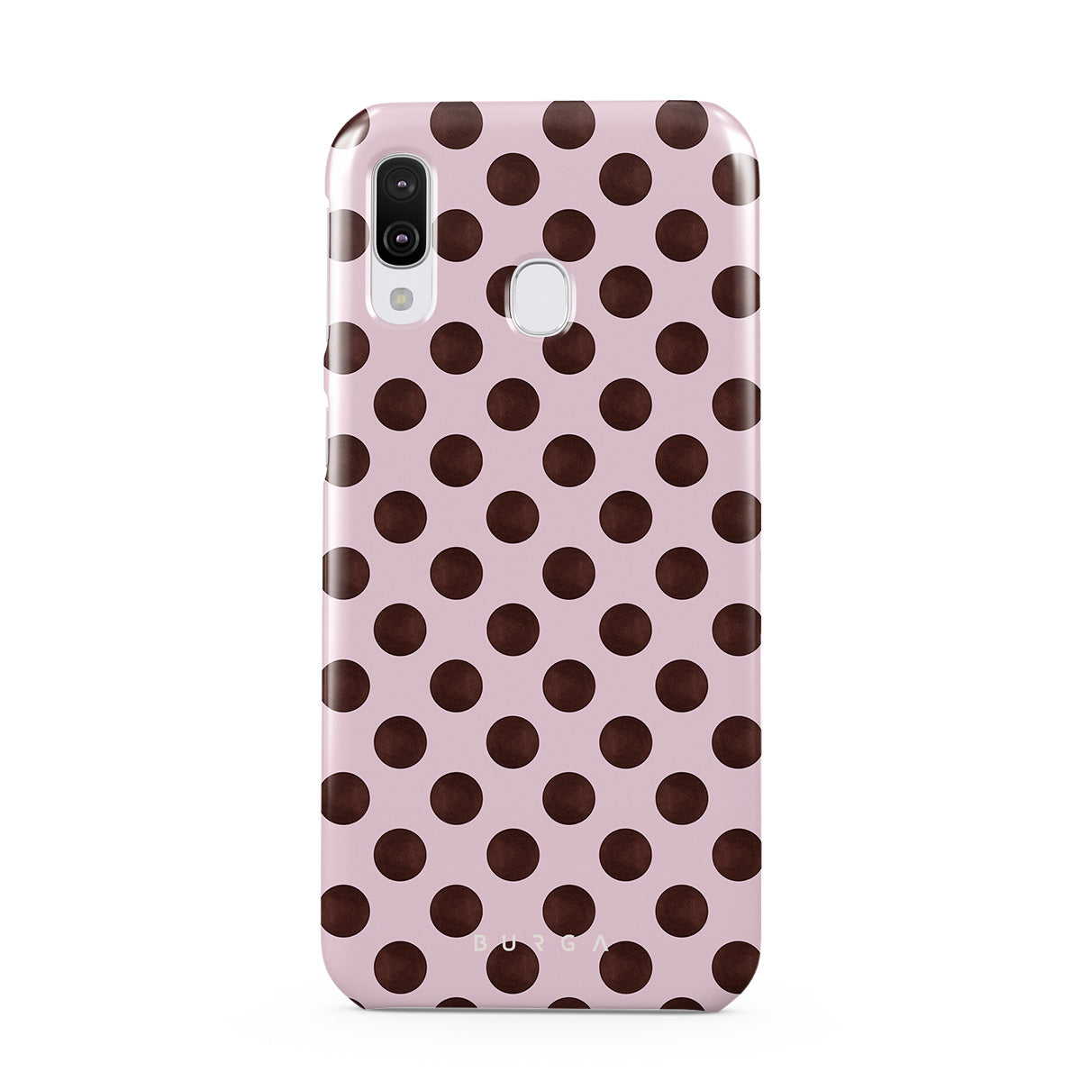 This design features: a retro polka dot pattern, pink background with brown polka dots.