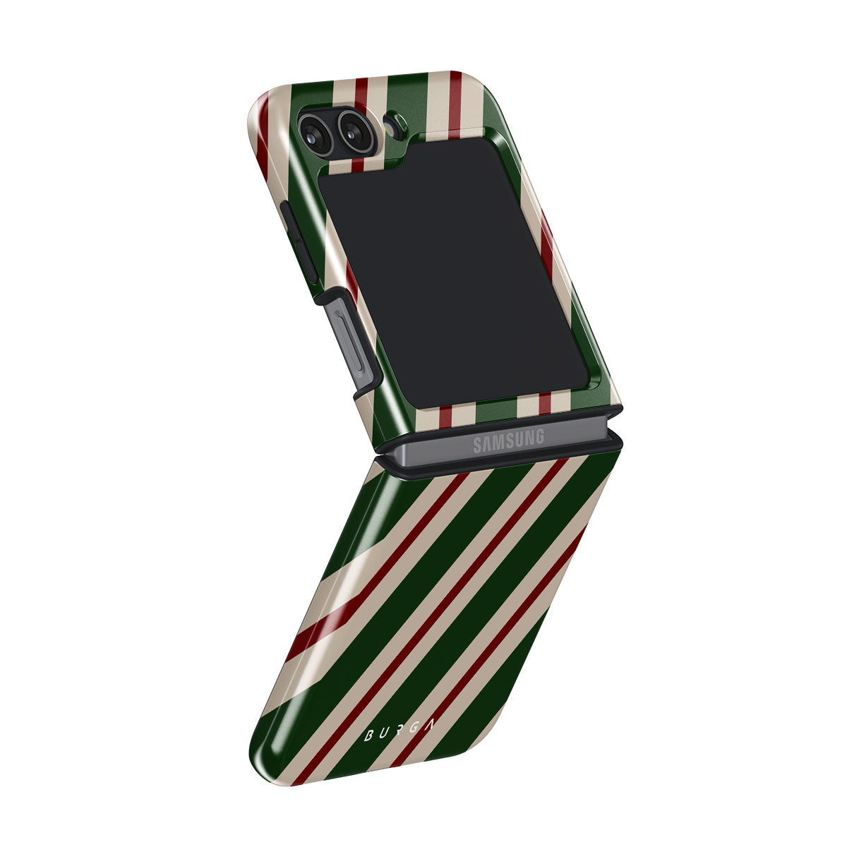 A joyful design that screams holiday spirit. Our North Pole Samsung Galaxy Z Flip 5 Case phone case transports you straight to Santa's workshop. Bold green, red, and white stripes echo the joy and laughter of elves preparing for the festive season.