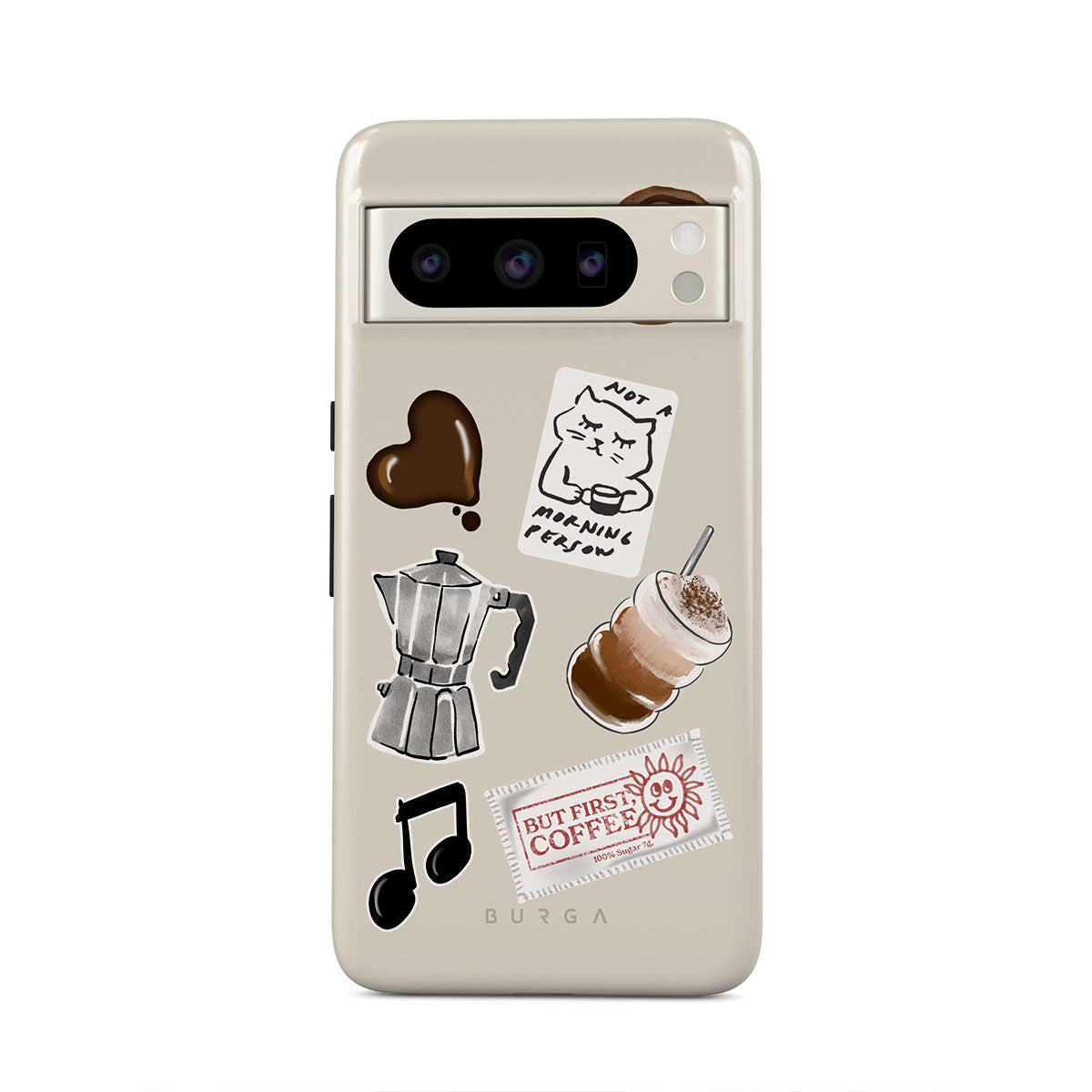 This design features: moka pot, frappe, cinnamon roll, chocolate heart, "Not a morning person" sticker, "But First, Coffee" receipt, music note