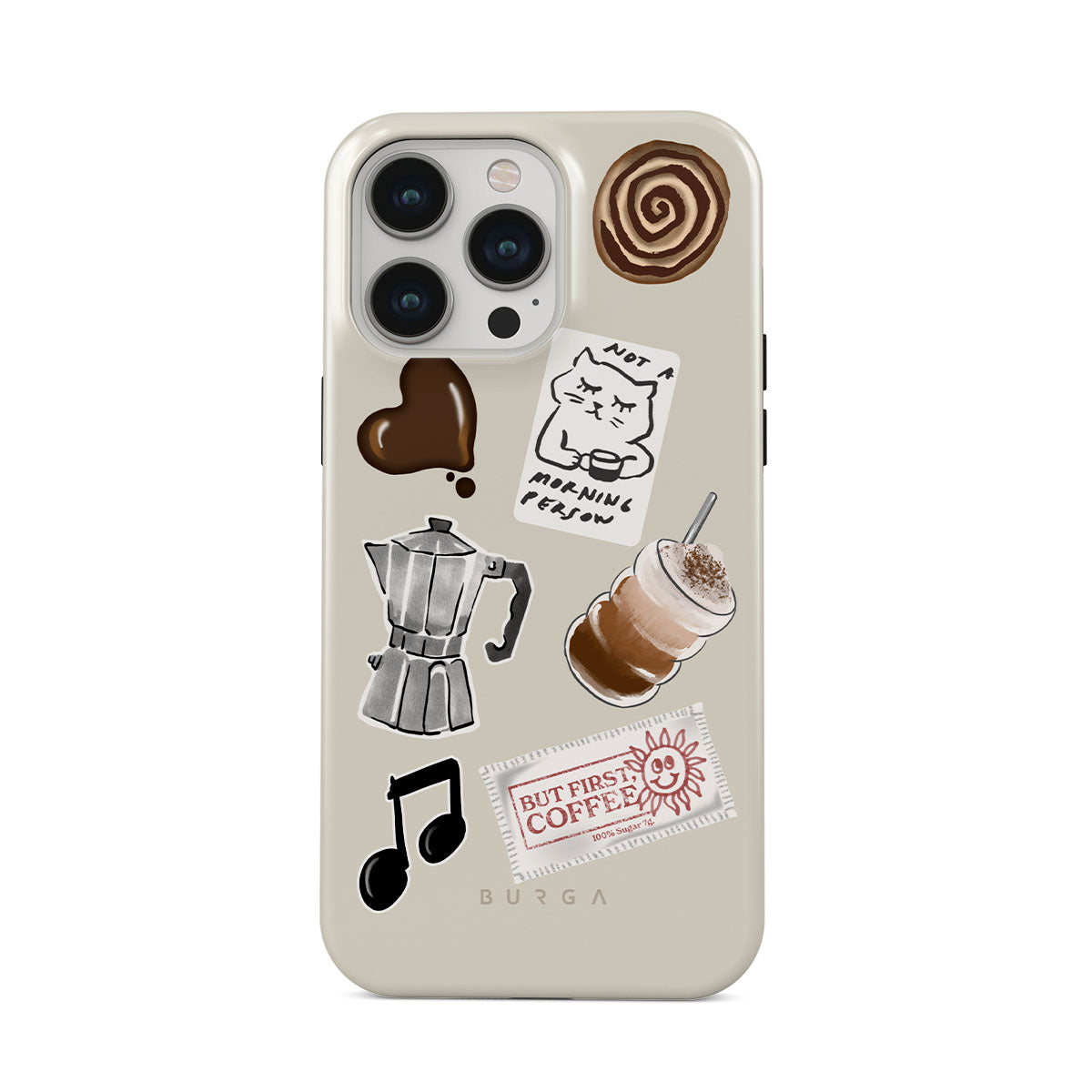 This design features: moka pot, frappe, cinnamon roll, chocolate heart, "Not a morning person" sticker, "But First, Coffee" receipt, music note