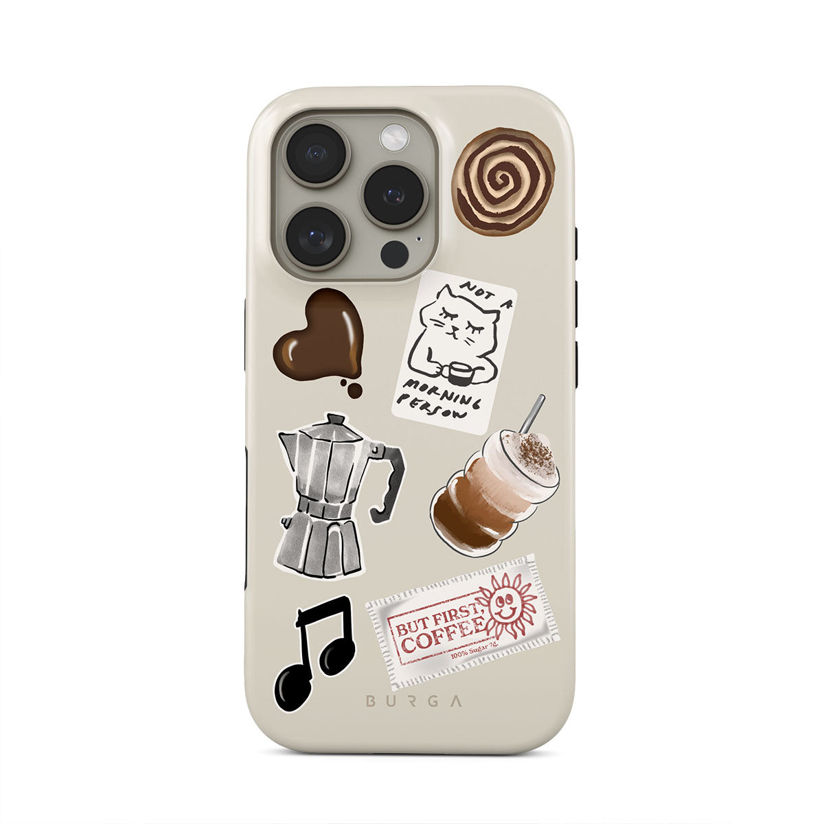 This design features: moka pot, frappe, cinnamon roll, chocolate heart, "Not a morning person" sticker, "But First, Coffee" receipt, music note