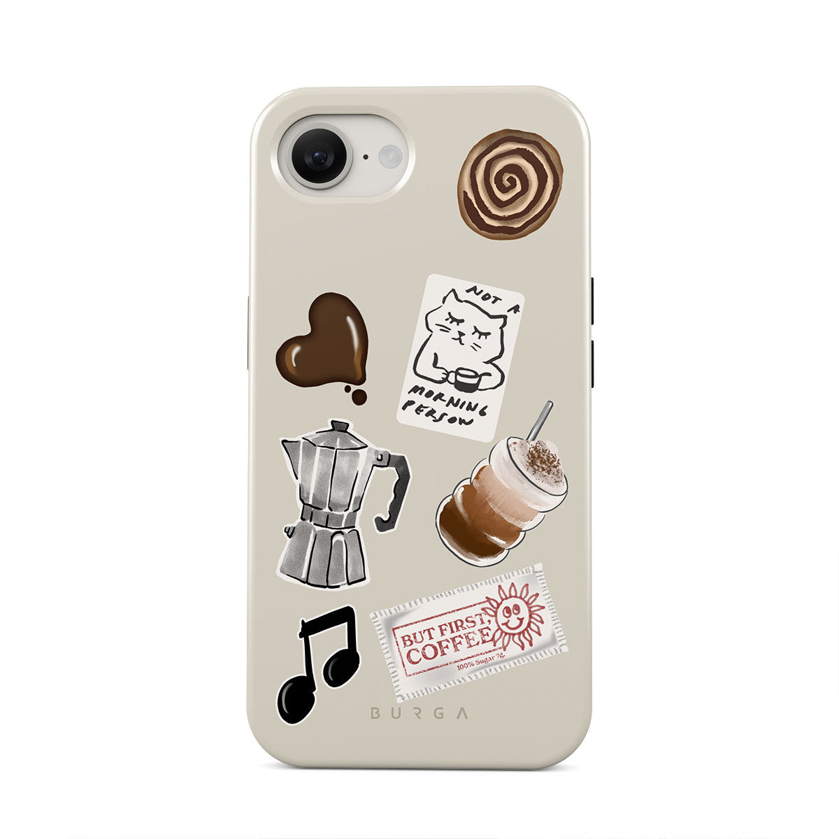 This design features: moka pot, frappe, cinnamon roll, chocolate heart, "Not a morning person" sticker, "But First, Coffee" receipt, music note