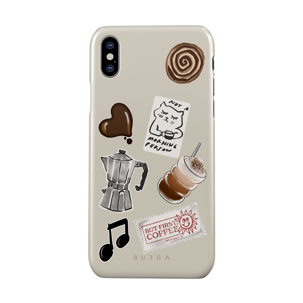 This design features: moka pot, frappe, cinnamon roll, chocolate heart, "Not a morning person" sticker, "But First, Coffee" receipt, music note
