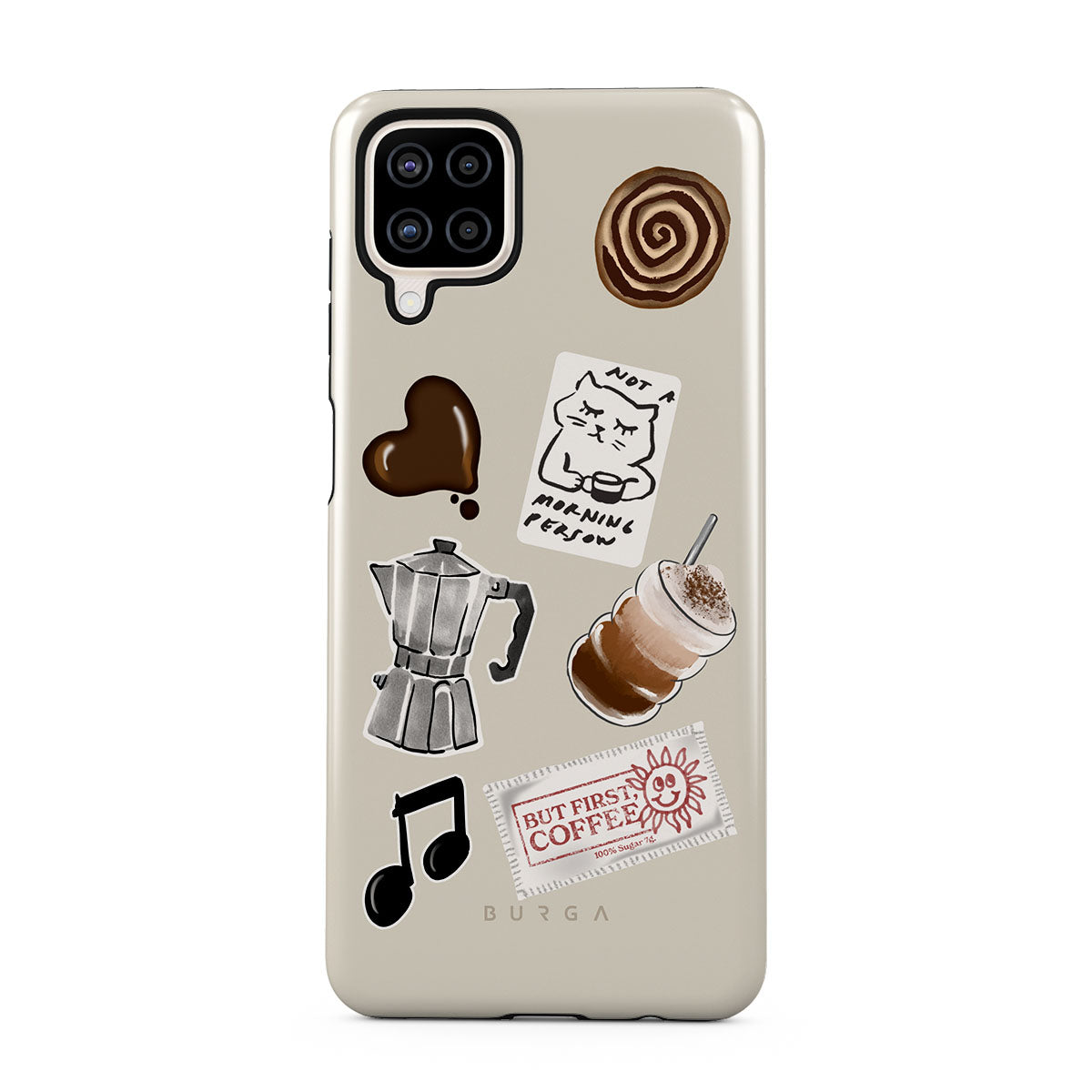 This design features: moka pot, frappe, cinnamon roll, chocolate heart, "Not a morning person" sticker, "But First, Coffee" receipt, music note