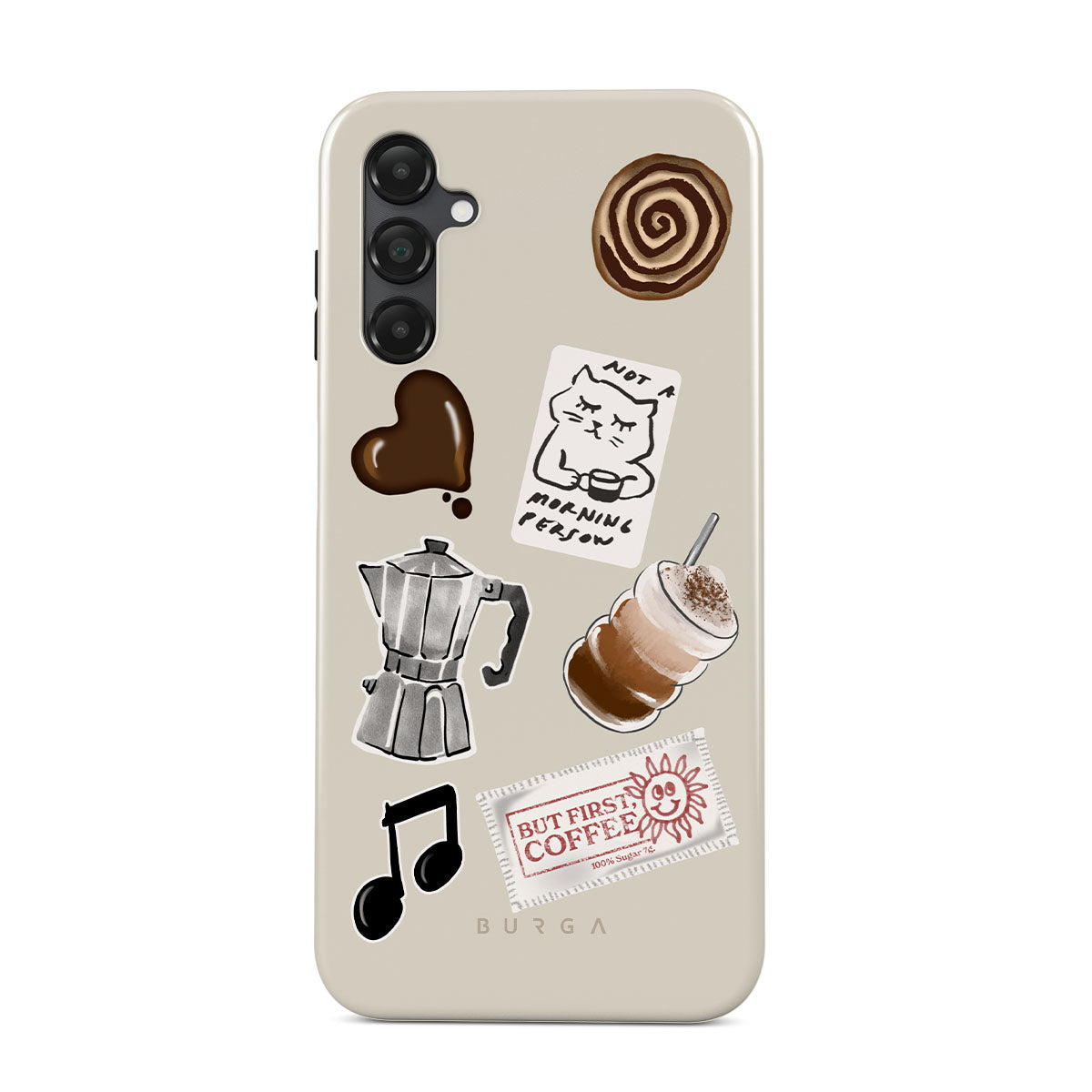 This design features: moka pot, frappe, cinnamon roll, chocolate heart, "Not a morning person" sticker, "But First, Coffee" receipt, music note