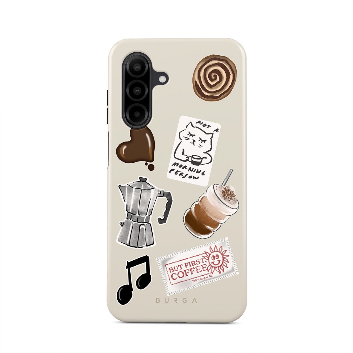 This design features: moka pot, frappe, cinnamon roll, chocolate heart, "Not a morning person" sticker, "But First, Coffee" receipt, music note