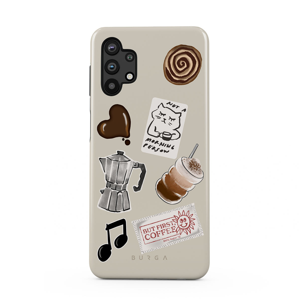 This design features: moka pot, frappe, cinnamon roll, chocolate heart, "Not a morning person" sticker, "But First, Coffee" receipt, music note