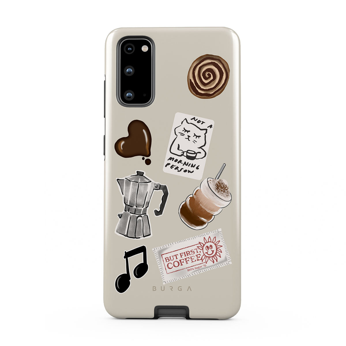 This design features: moka pot, frappe, cinnamon roll, chocolate heart, "Not a morning person" sticker, "But First, Coffee" receipt, music note