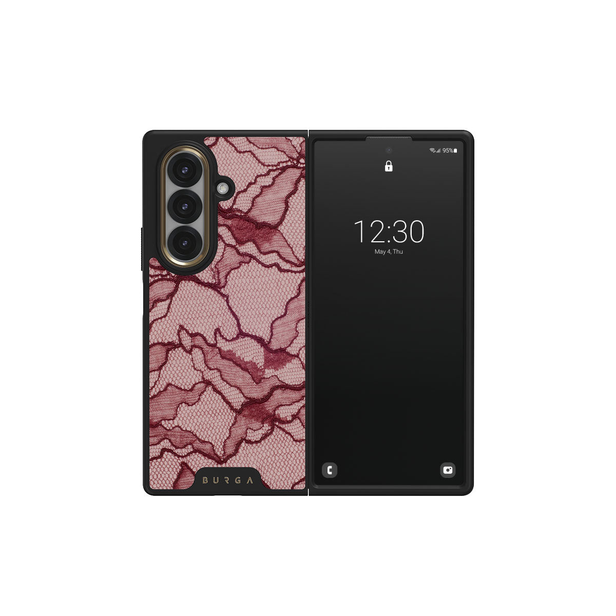 Channel your inner power with our Office Siren Samsung Galaxy Z Fold 7 phone case design. A soft rosé backdrop and dark pink lace blend elegance and boldness, perfect for those who make quiet yet undeniable statements with confidence.