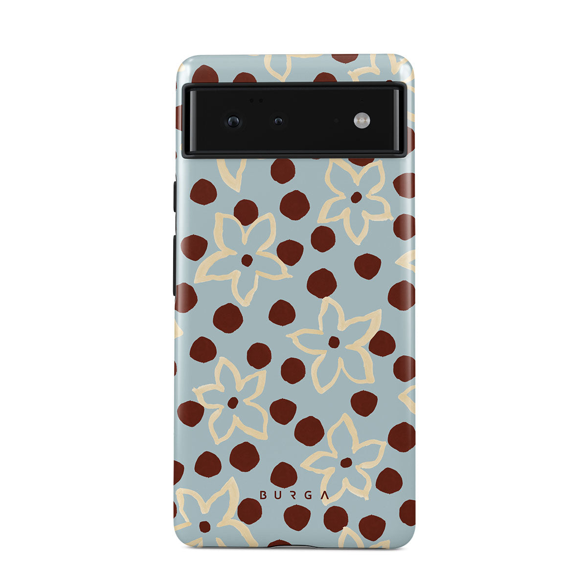 The Frutaria Google Pixel 6a phone case design design: retro surf motel wallpaper meets vintage ceramics. The soft florals, earthy dots, and cool-toned palette give major “forgotten seaside town in the ‘70s” energy.