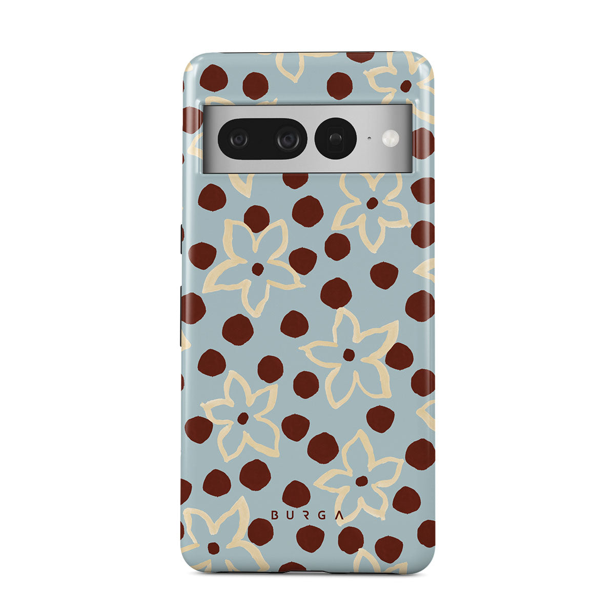 The Frutaria Google Pixel 7 Pro phone case design design: retro surf motel wallpaper meets vintage ceramics. The soft florals, earthy dots, and cool-toned palette give major “forgotten seaside town in the ‘70s” energy.