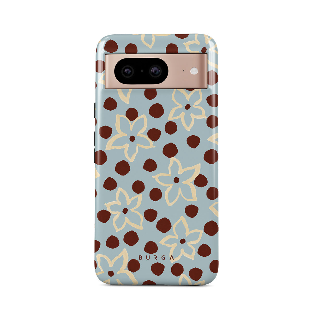 The Frutaria Google Pixel 8 phone case design design: retro surf motel wallpaper meets vintage ceramics. The soft florals, earthy dots, and cool-toned palette give major “forgotten seaside town in the ‘70s” energy.