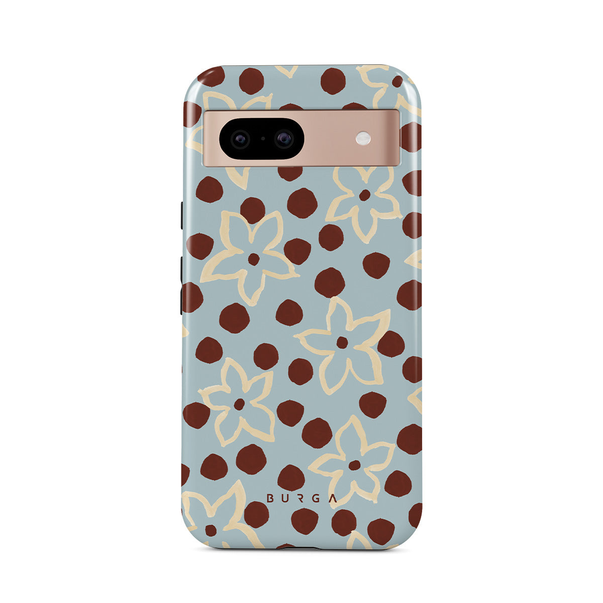 The Frutaria Google Pixel 8a phone case design design: retro surf motel wallpaper meets vintage ceramics. The soft florals, earthy dots, and cool-toned palette give major “forgotten seaside town in the ‘70s” energy.