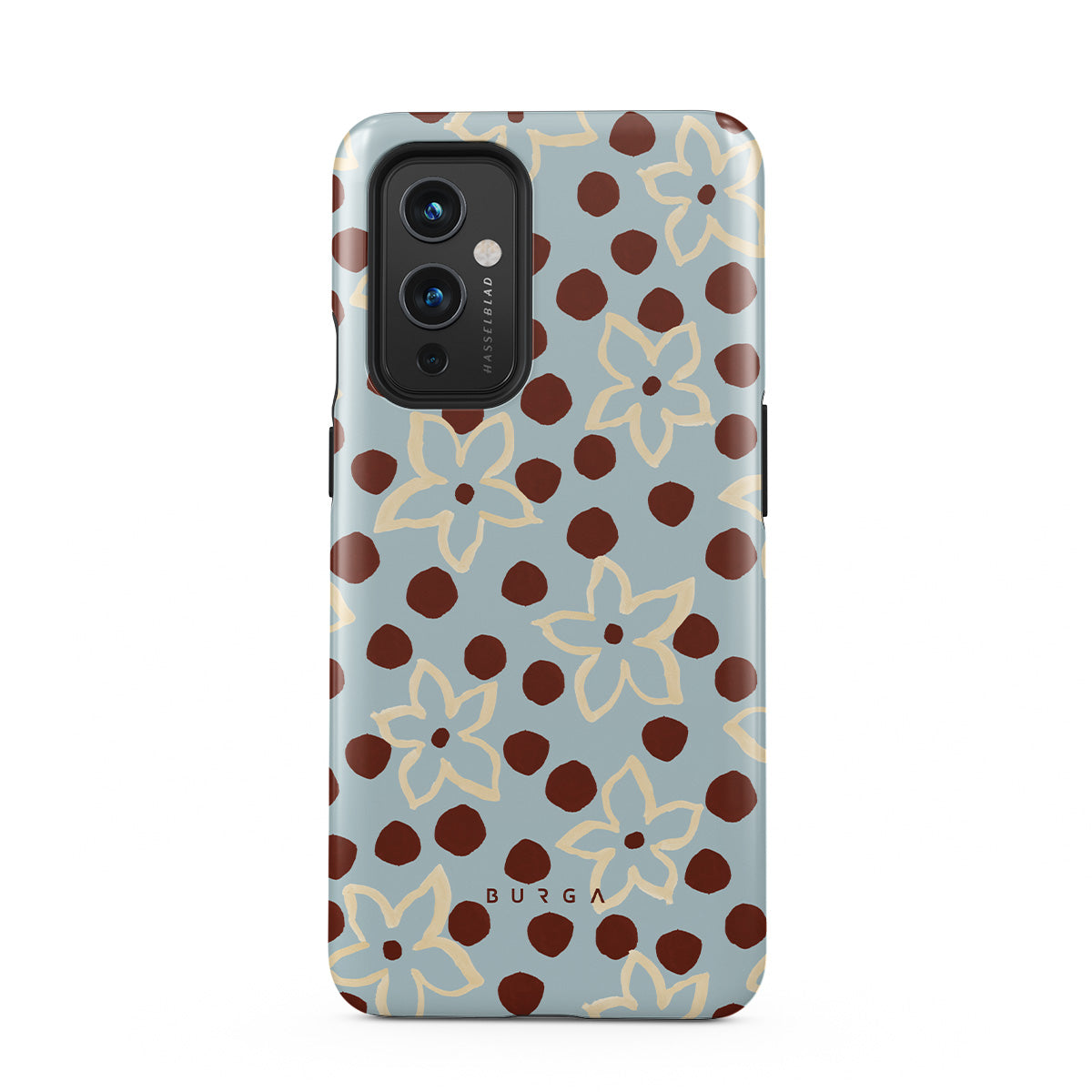 The Frutaria OnePlus 9 phone case design design: retro surf motel wallpaper meets vintage ceramics. The soft florals, earthy dots, and cool-toned palette give major “forgotten seaside town in the ‘70s” energy.