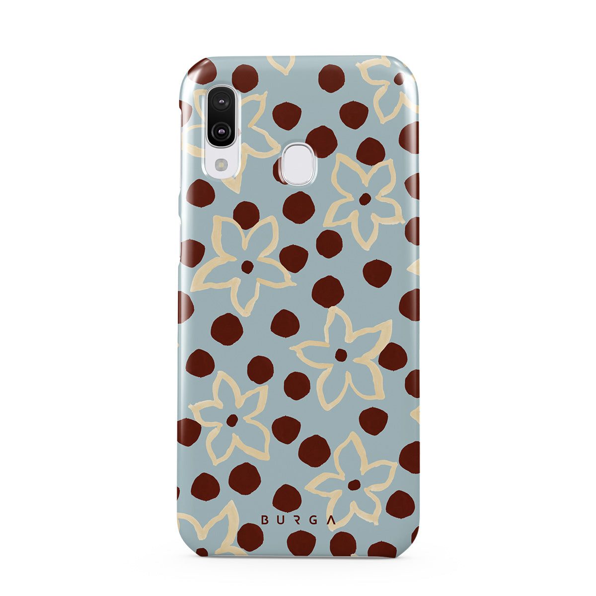 The Frutaria Samsung Galaxy A40 phone case design design: retro surf motel wallpaper meets vintage ceramics. The soft florals, earthy dots, and cool-toned palette give major “forgotten seaside town in the ‘70s” energy.