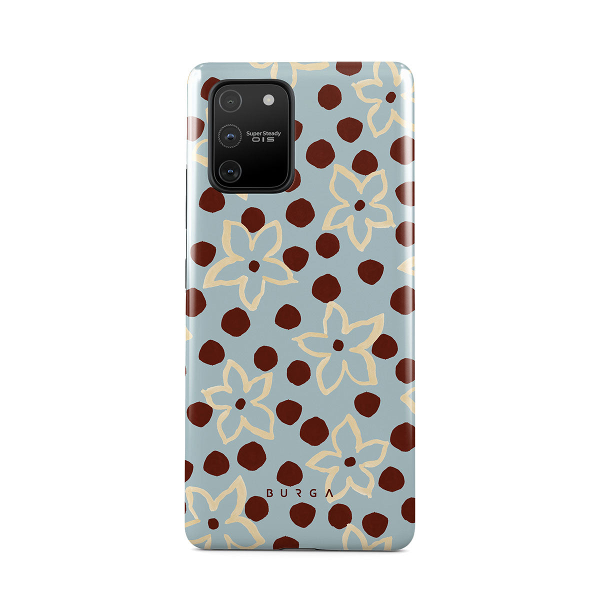 The Frutaria Samsung Galaxy S10 Lite phone case design design: retro surf motel wallpaper meets vintage ceramics. The soft florals, earthy dots, and cool-toned palette give major “forgotten seaside town in the ‘70s” energy.