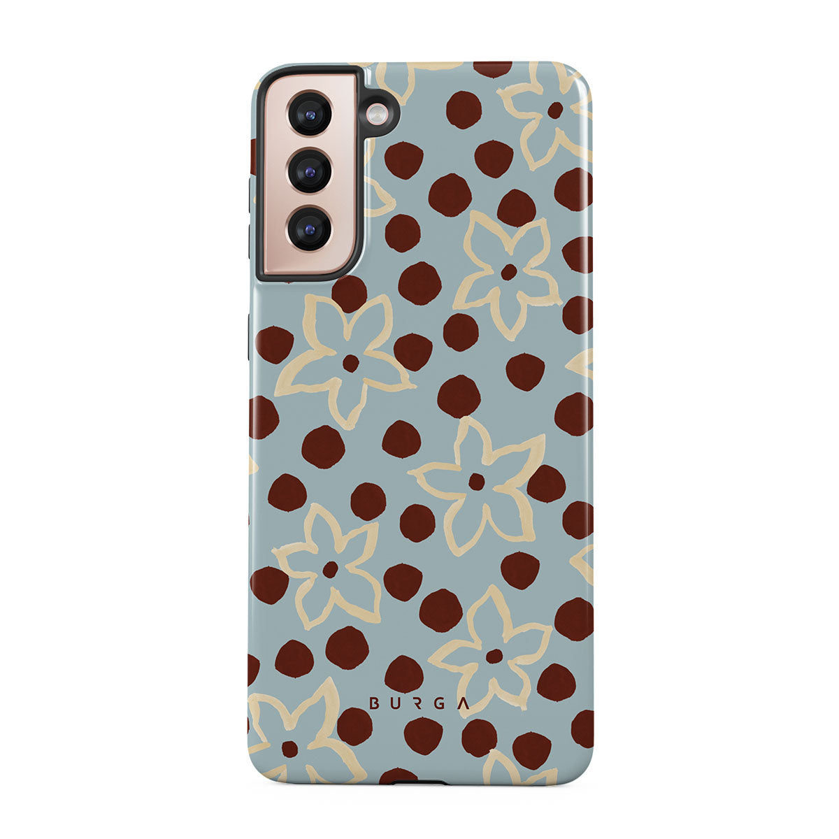 The Frutaria Samsung Galaxy S21 Plus phone case design design: retro surf motel wallpaper meets vintage ceramics. The soft florals, earthy dots, and cool-toned palette give major “forgotten seaside town in the ‘70s” energy.