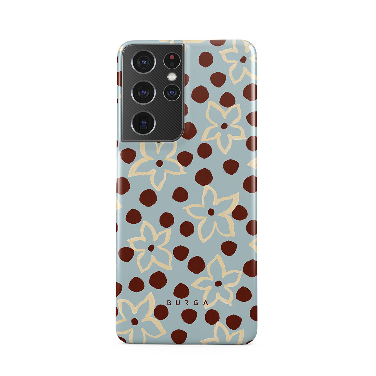 The Frutaria Samsung Galaxy S21 Ultra phone case design design: retro surf motel wallpaper meets vintage ceramics. The soft florals, earthy dots, and cool-toned palette give major “forgotten seaside town in the ‘70s” energy.