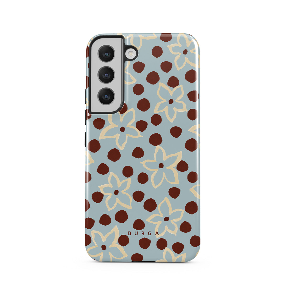 The Frutaria Samsung Galaxy S22 Plus phone case design design: retro surf motel wallpaper meets vintage ceramics. The soft florals, earthy dots, and cool-toned palette give major “forgotten seaside town in the ‘70s” energy.