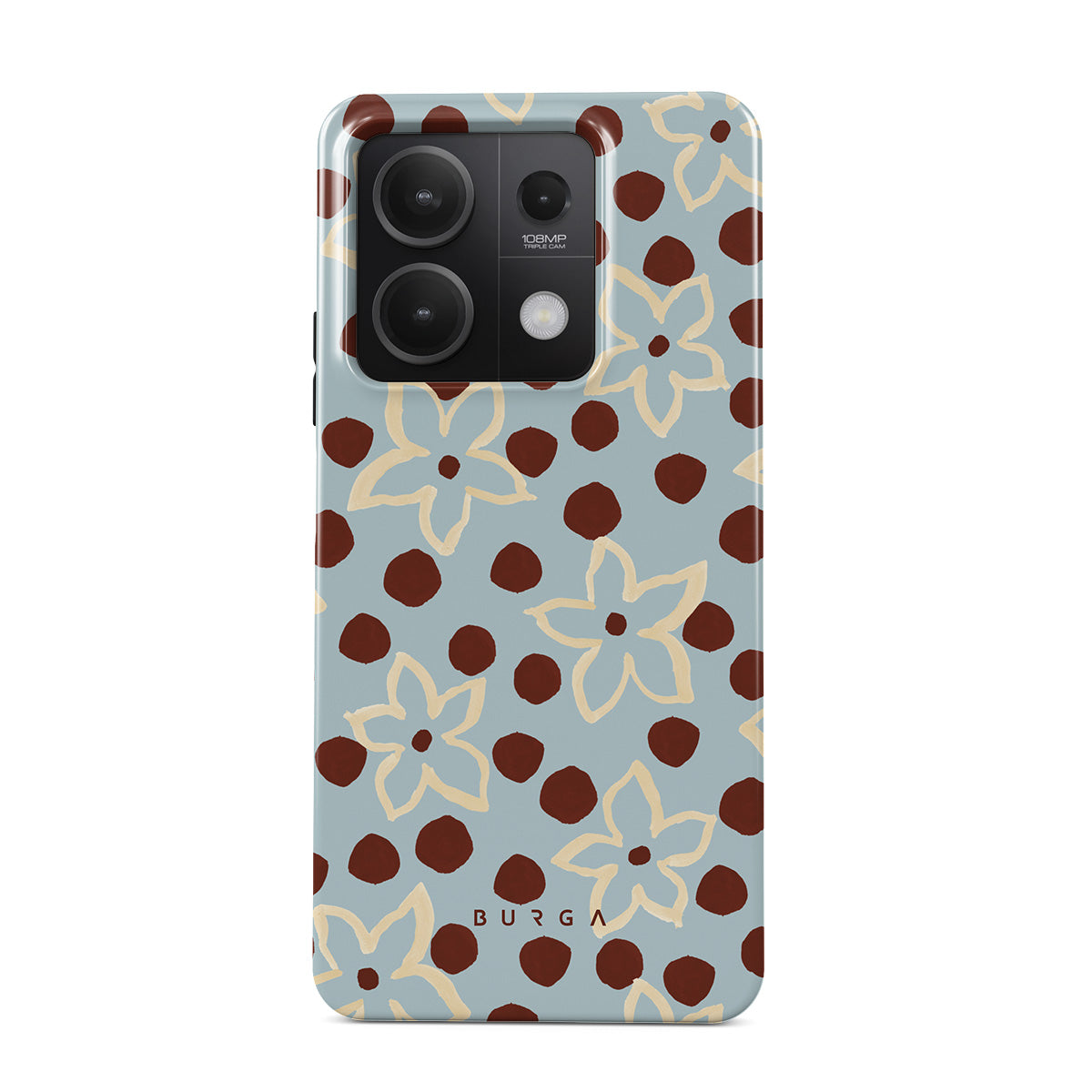 The Frutaria Xiaomi Redmi Note 13 5G phone case design design: retro surf motel wallpaper meets vintage ceramics. The soft florals, earthy dots, and cool-toned palette give major “forgotten seaside town in the ‘70s” energy.