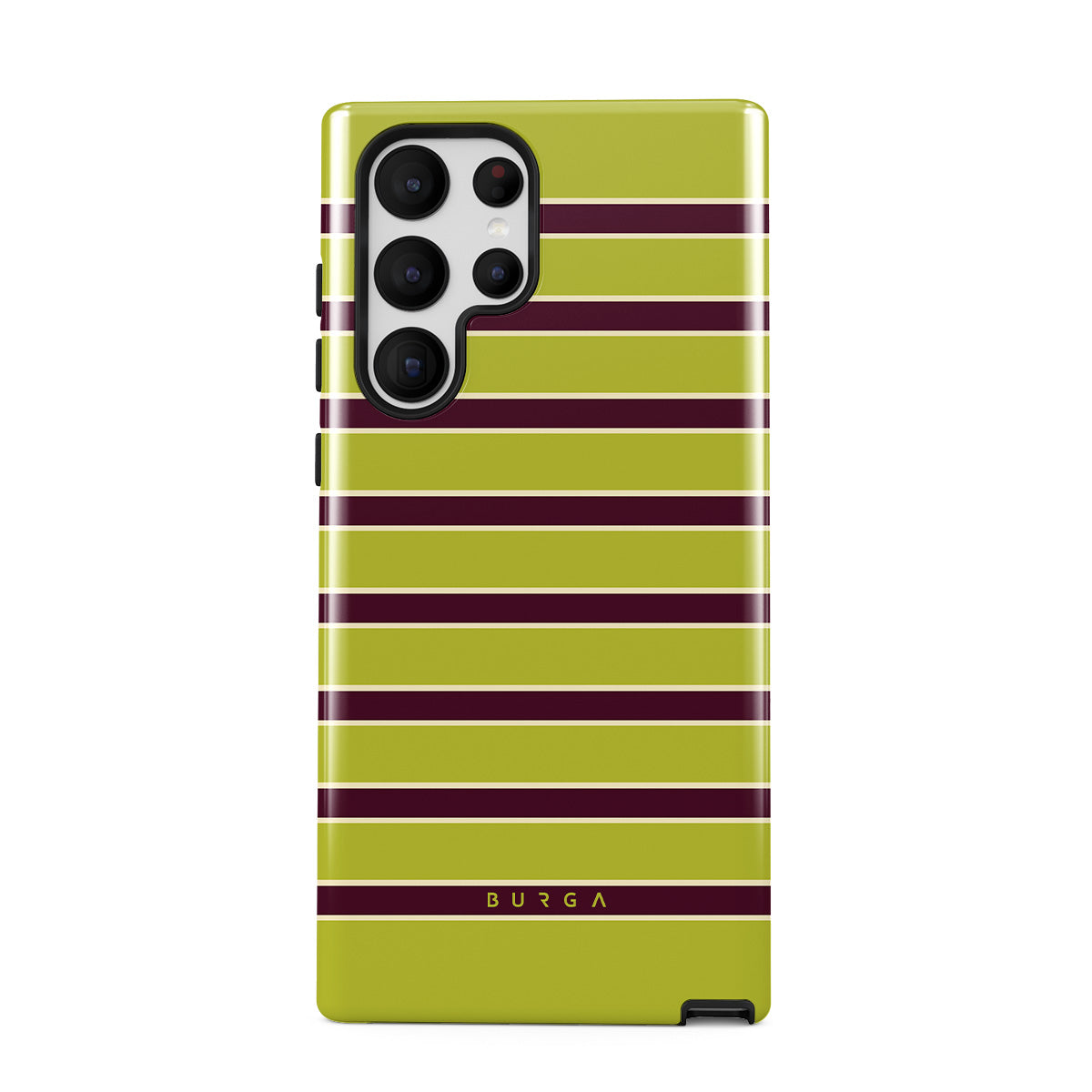 This design features: thick horizontal stripes in lime green and burgundy .