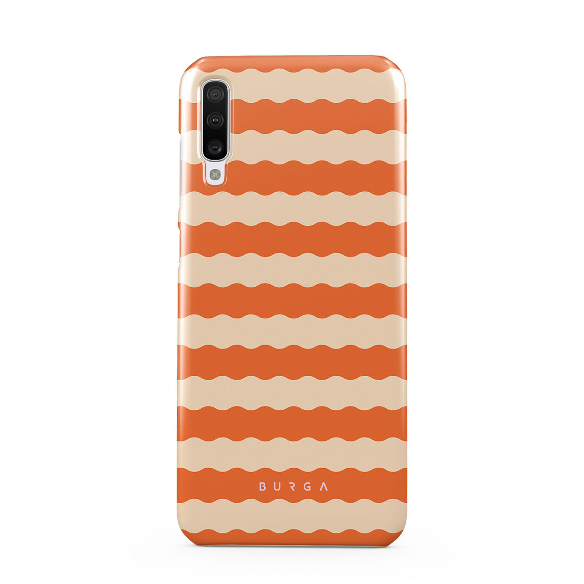 Unleash the tropical heat with the our Papaya design—a sizzling Samsung Galaxy A70 phone case that electrifies with fiery, wavy stripes of juicy papaya orange and smooth, creamy beige. Perfect for trendsetters craving a daring, sun-soaked style.
