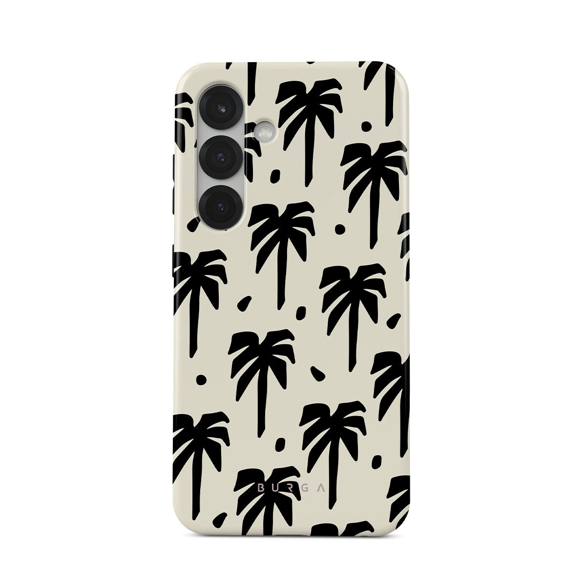 A peaceful haven right at your fingertips. The design contrasts black palm silhouettes against a calming light backdrop. Our Paraíso Samsung Galaxy S25 phone case is your passport to an everlasting tropical escape.