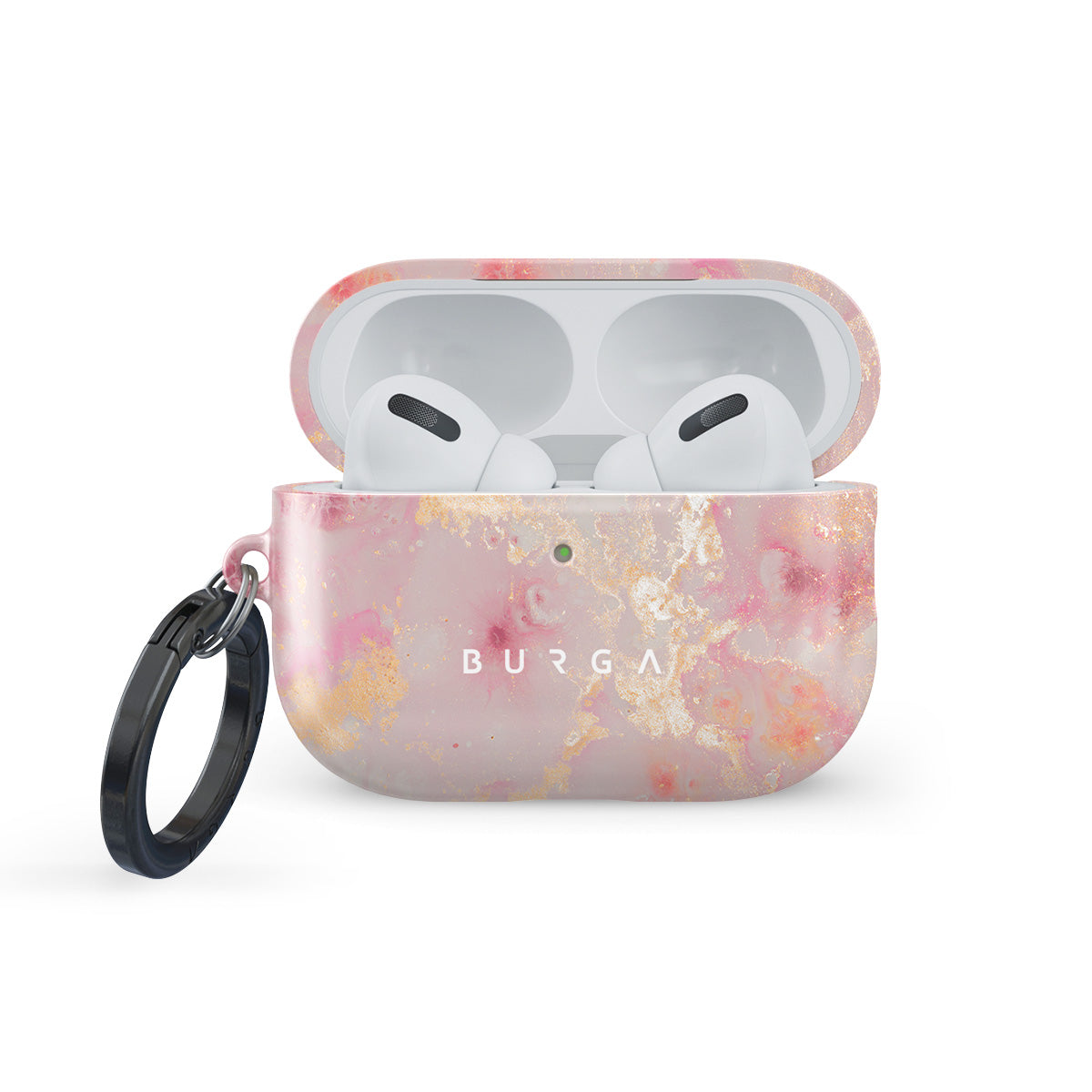 Our pretty and pink Golden Coral Apple AirPods Pro 3 case cover combines a scenery of sunlit corals and pastel pink softness. But do not be deceived by the unique pink marble cover. It still keeps y Our case safe and sound. Beauty and safety go hand in hand here. Our case fits perfectly snug around Apple AirPods Pro 3 . “Like a glove!” one might say. And it won’t disrupt the wireless charging capabilities of the newer model. There’s even an LED light indicator to prove it (don’t worry, wired charging still works, too). When fitted, the BURGA case will protect the delicate Apple AirPods Pro 3 case beneath it from scratches, bumps, and drops while remaining scratch-free itself. Our signature design pattern prints are High Quality, and will never peel or fade away- thanks to our unique printing technology. And finally, a handy carabiner is there to make your life easier and more convenient: just snap it around your keys or belt loop and tackle the day head-on. Your music is right there by your side when you need it.