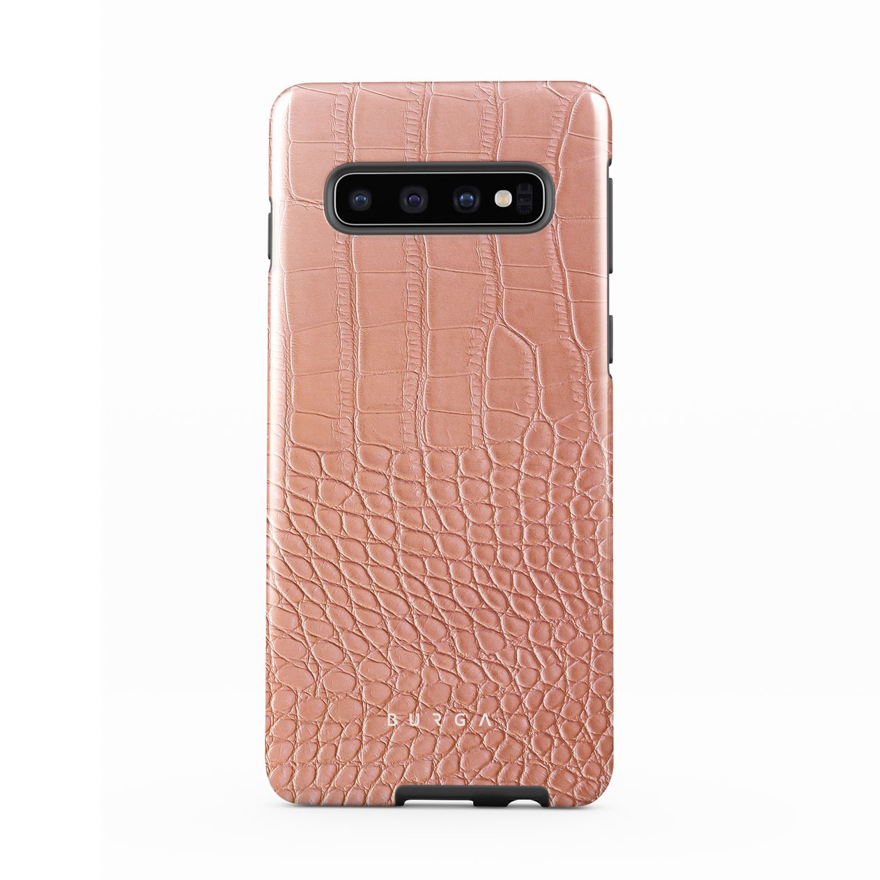 Our Pink Croco Samsung Galaxy S10 phone case features a classic crocodile design reimagined and showcased in a soft coral shade. The new take on the dangerous animal print will add a touch of softness to your style while simultaneously offering heavy-duty protection to your device.