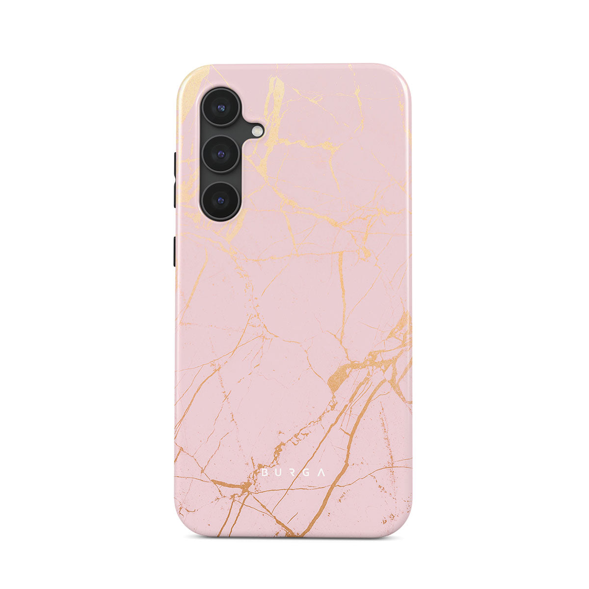Growing under the beautiful sky and warmed by the rays of the sunshine, when ripped, peach offers you sweetness and softness. This is why our Peachy Gold Samsung Galaxy S23 FE phone case design adds a bit of golden color to the pink marble dream making a protective phone case both pretty and durable.