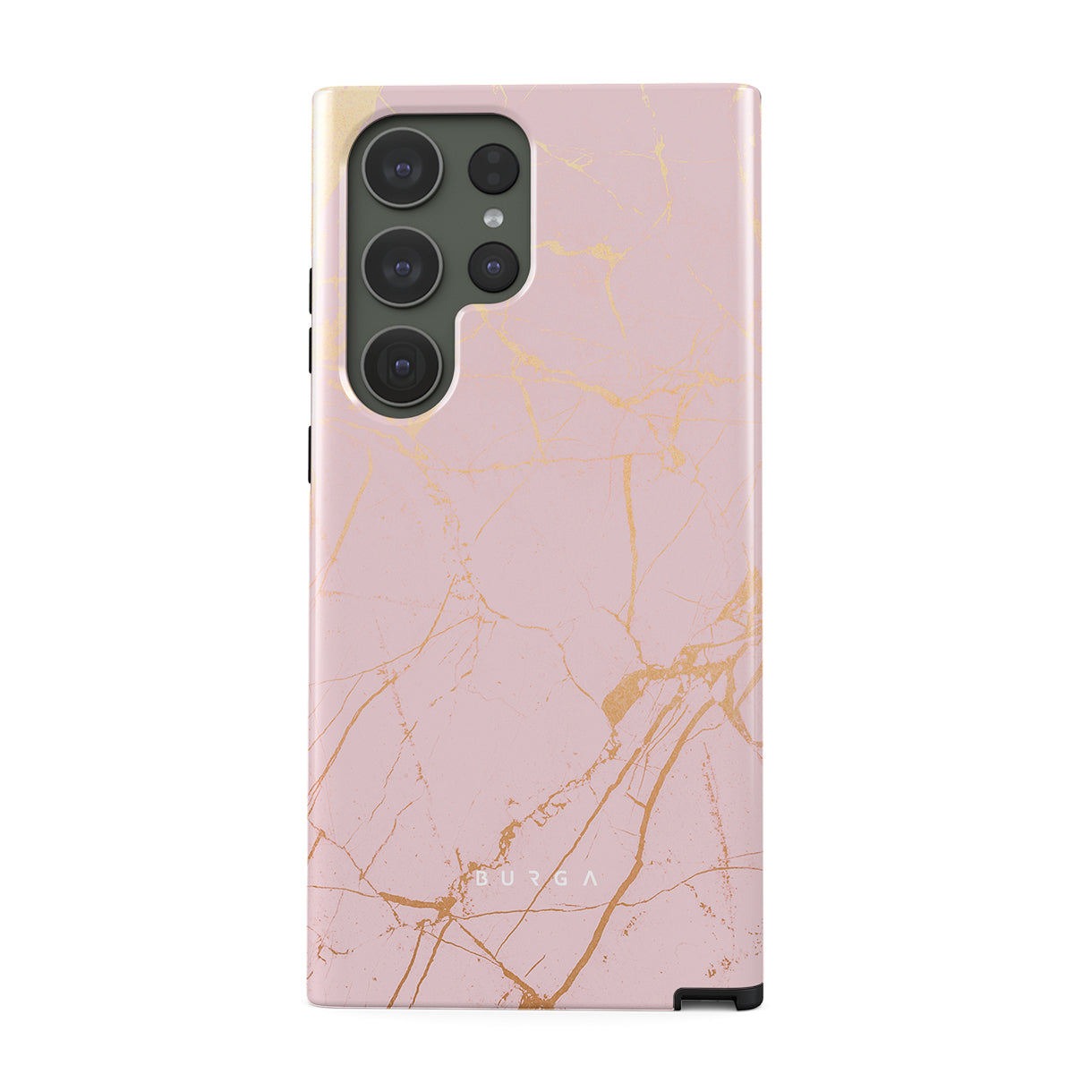 Growing under the beautiful sky and warmed by the rays of the sunshine, when ripped, peach offers you sweetness and softness. This is why our Peachy Gold Samsung Galaxy S23 Ultra phone case design adds a bit of golden color to the pink marble dream making a protective phone case both pretty and durable.