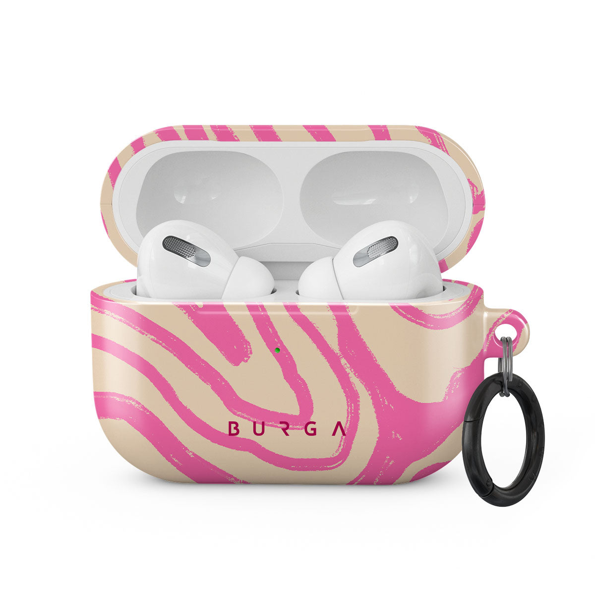 The Pink Shores Apple AirPods Pro case cover features mesmerizing pink swirls on a cream background. This vibrant, beach-insipired pattern captures the serene beauty of sandy beaches kissed by soft pink waves. Perfect for those who love unique, ocean-inspired aesthetics.