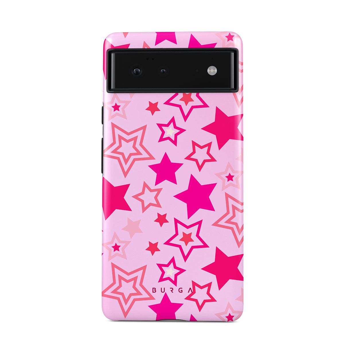 Buckle up for a starry ride, and let's twirl under the Plastic Sky. Neon stars shimmering across a cheeky rose-tinted galaxy create a playful space-disco atmosphere. Be the center of the universe with our Plastic Sky Google Pixel 6a phone case!