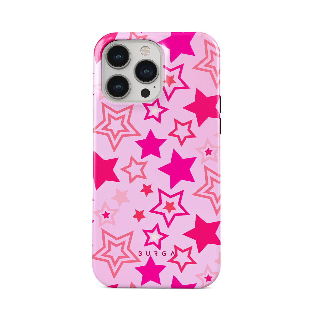 Buckle up for a starry ride, and let's twirl under the Plastic Sky. Neon stars shimmering across a cheeky rose-tinted galaxy create a playful space-disco atmosphere. Be the center of the universe with our Plastic Sky iPhone 14 Pro phone case!