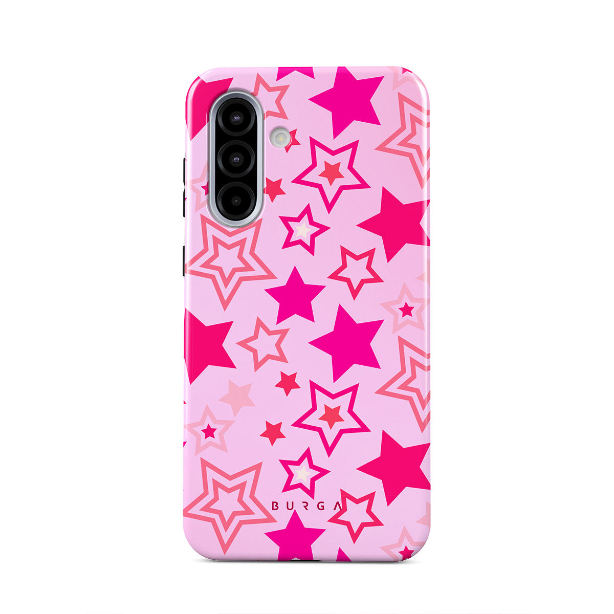 Buckle up for a starry ride, and let's twirl under the Plastic Sky. Neon stars shimmering across a cheeky rose-tinted galaxy create a playful space-disco atmosphere. Be the center of the universe with our Plastic Sky Samsung Galaxy A56 5G phone case!