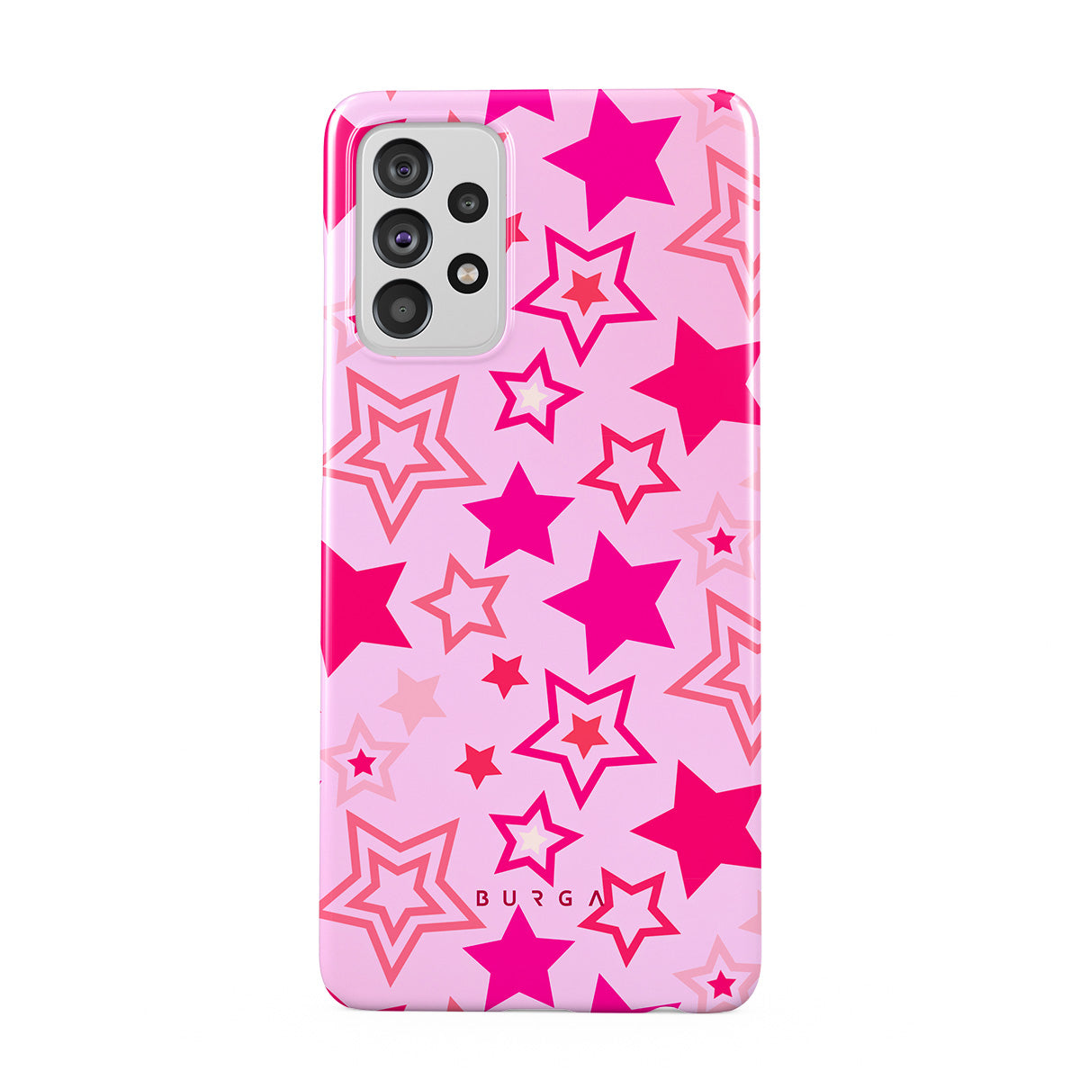 Buckle up for a starry ride, and let's twirl under the Plastic Sky. Neon stars shimmering across a cheeky rose-tinted galaxy create a playful space-disco atmosphere. Be the center of the universe with our Plastic Sky Samsung Galaxy A72 4G / 5G phone case!