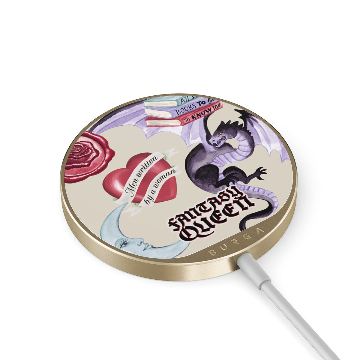 This design features: purple dragon, "Fantasy Queen" sticker, crescent moon, purple wax seal, heart with message, books
